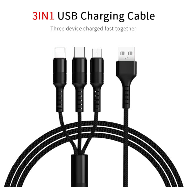 3-in-1 nylon USB cable for charging, featuring Lightning, Type-C and MicroUSB connectors. Ideal for those who have multiple devices with different connectors and want to always have the right cable at hand. It can also charge 3 devices at the same time.